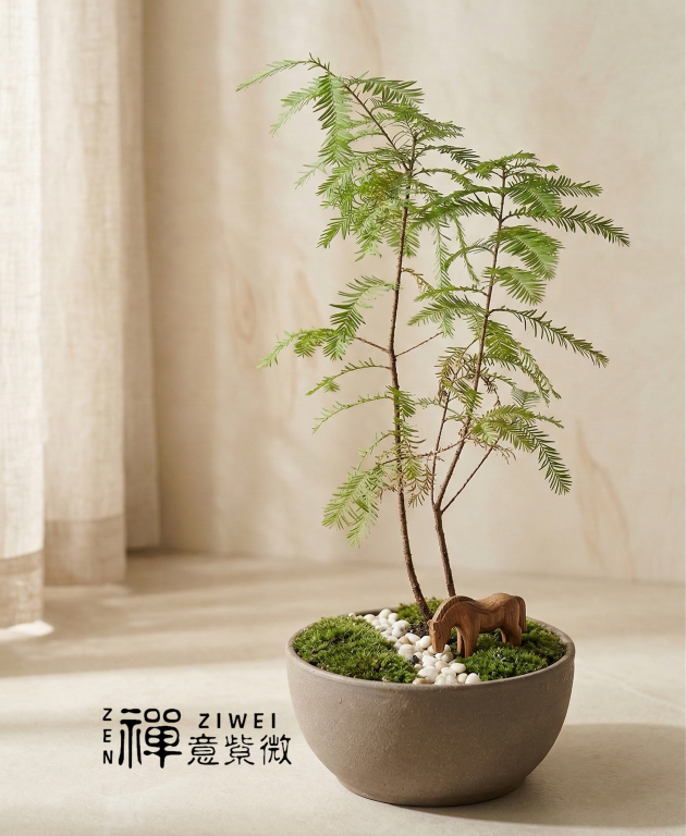 禪意倒影:如果您有水池或使用寬口水盤種植,落羽松的倒影更是絕美,能營造出極致寧靜的「侘寂(Wabi-Sabi)」氛圍。